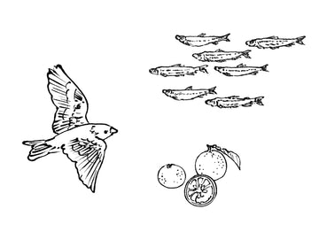 Instagramに載せた動画は、実際にデザイナーが絵を描く速度そのまま。さらっと描いていますが、なんとも筆の強弱が心地よく、線のみで表現しているのに鳥の羽の軽い質感が伝わります。その他、青々とした野菜や、魚のきりっとした光沢も、絵に色がついていなくても感じ取れますよね。