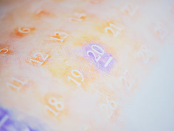 日にちを表す日玉の数字よりも、 そのうしろで滔々と流れる時間のつながりや、 目には見えない人それぞれの日々を表現するため 日玉には色をつけず、背景に色を重ねていったというカレンダーです。なので、日玉の部分は、紙の地の色のまま。数字を浮かび上がらせるために、色を重ねて、重ねて、重ねて。壁に、綺麗な色の絵を飾るような感覚でお使いいただけます。