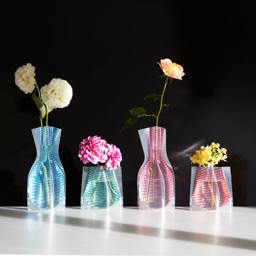 一見すると何気ないビニールパックのようですが、水を入れるだけで美しい花びんに変身する、ビニール製の花瓶です。水を入れた時の光の屈折が美しく、割れることもないため安全で、折りたたむと場所をとらずに収納できます。