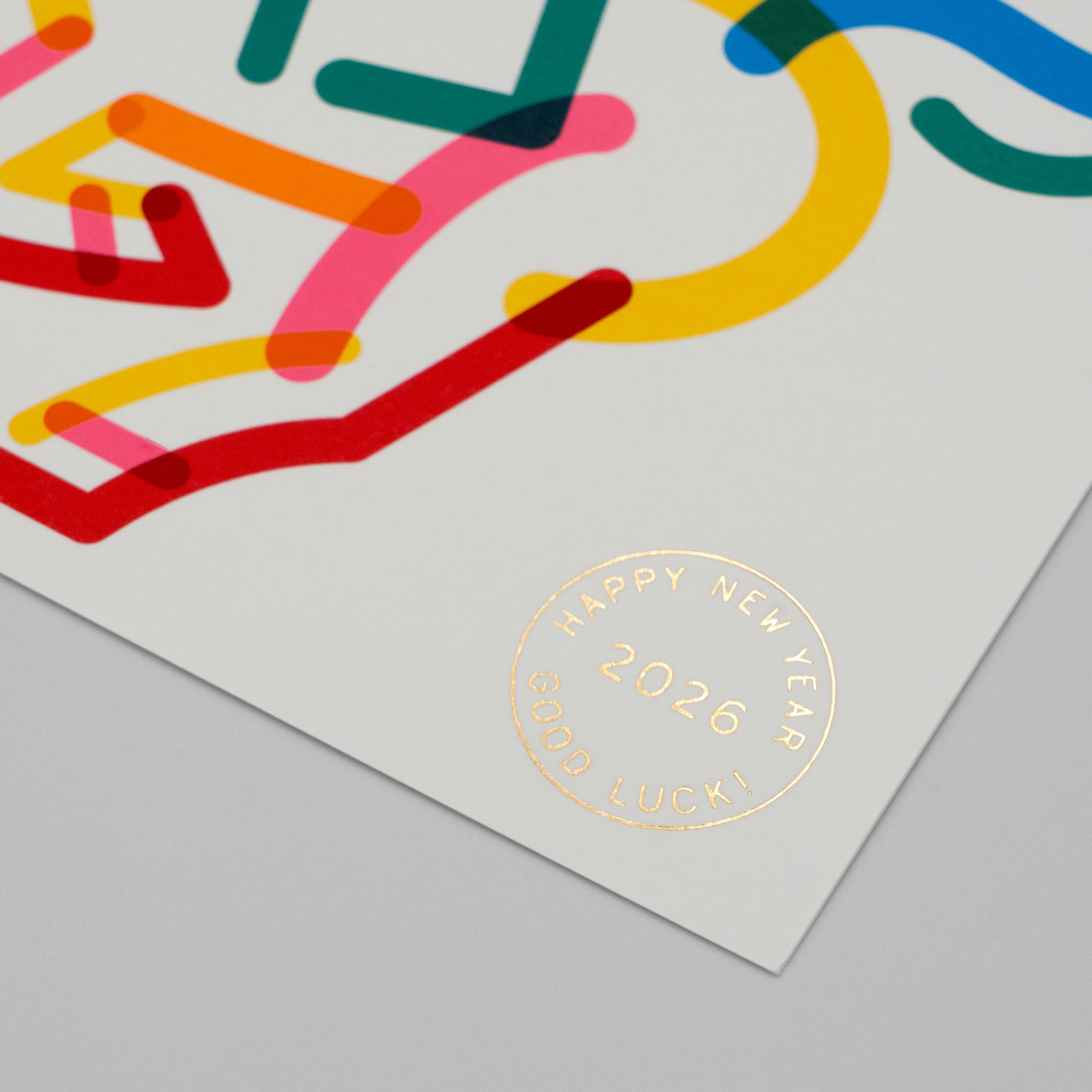 カラフルな線で表現した馬が軽やかに走るデザインです。右下に「HAPPY NEW YEAR 2026 GOOD LUCK!」と金箔で箔押しされています。